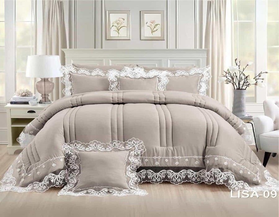 اللون الرمادي الفاتح: يعد من الألوان العصرية الرائجة في وقتنا الحالي، ويعكس طابع عصري هادئ في الغرفة على سبيل المثال مفرش ليسا مايكروفايبر دانتيل – نفرين 8 قطع – رمادي فاتح