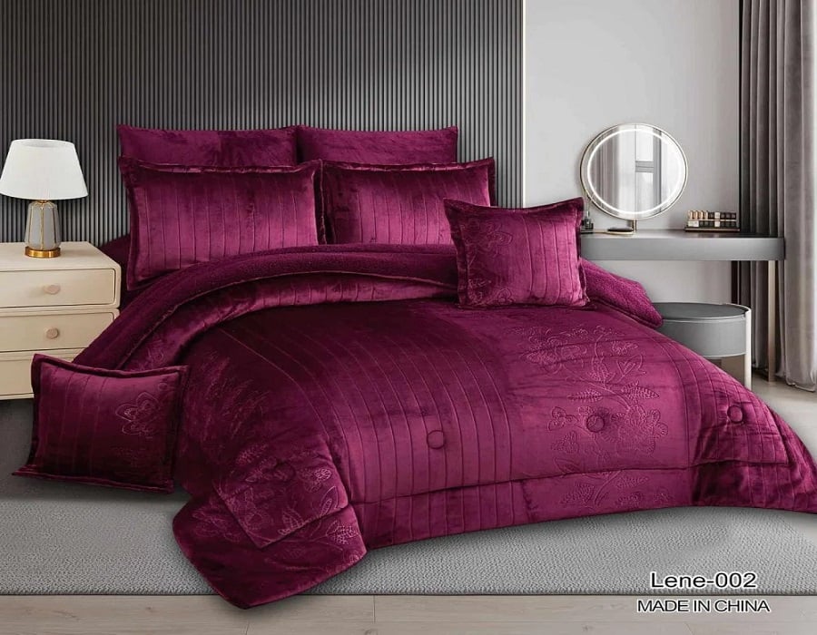 - مفرش لين فرو مخمل شتوي – نفرين 8 قطع باللون العنابي لإطلالة دافئة وراقية، تفاصيل التصميم متقنة بنقوش وخطوط فخمة تبرز جمال المفرش، احصل على المفرش من هنا.