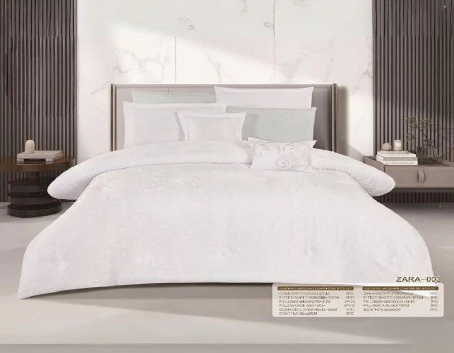 مفرش زارا الفاخر من نسيج جاكار- نفرين 8 قطع باللون الأبيض أيقونة النقاء والإشراق، فيضفي الهدوء والحيوية إلى جو الغرفة، ويتميز بتصميمه الفاخر الأنيق، يعد من الألوان والتصاميم المحببة لدى العرايس.