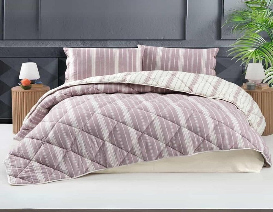 مفرش باريس مقلم – نفرين 8 قطع باللونين الوردي والأبيض لمزيج عصري فريد من نوعه يمنح الفراش لمسة من الحيوية والجمال، فيوفر لك الراحة طوال الليل لنوم مريح.