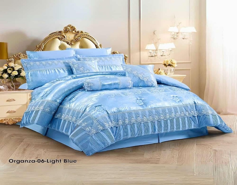 مفرش جاكار أوركنزا – نفرين 9 قطع باللون الأزرق الذي يضيف الهدوء والراحة إلى غرفة النوم، مما يساهم في خلق أجواء من الراحة والاسترخاء لنوم جيد.