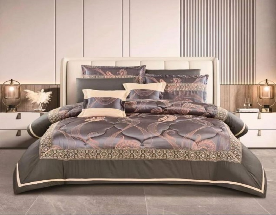 مفرش ريفان المطرز – نفرين 8 قطع باللون الرمادي الأنيق الذي ينح الغرفة لمسة عصرية جذابة، يحتوي المفرش على نقوش محفورة وتطريز بخيوط فاخرة.
